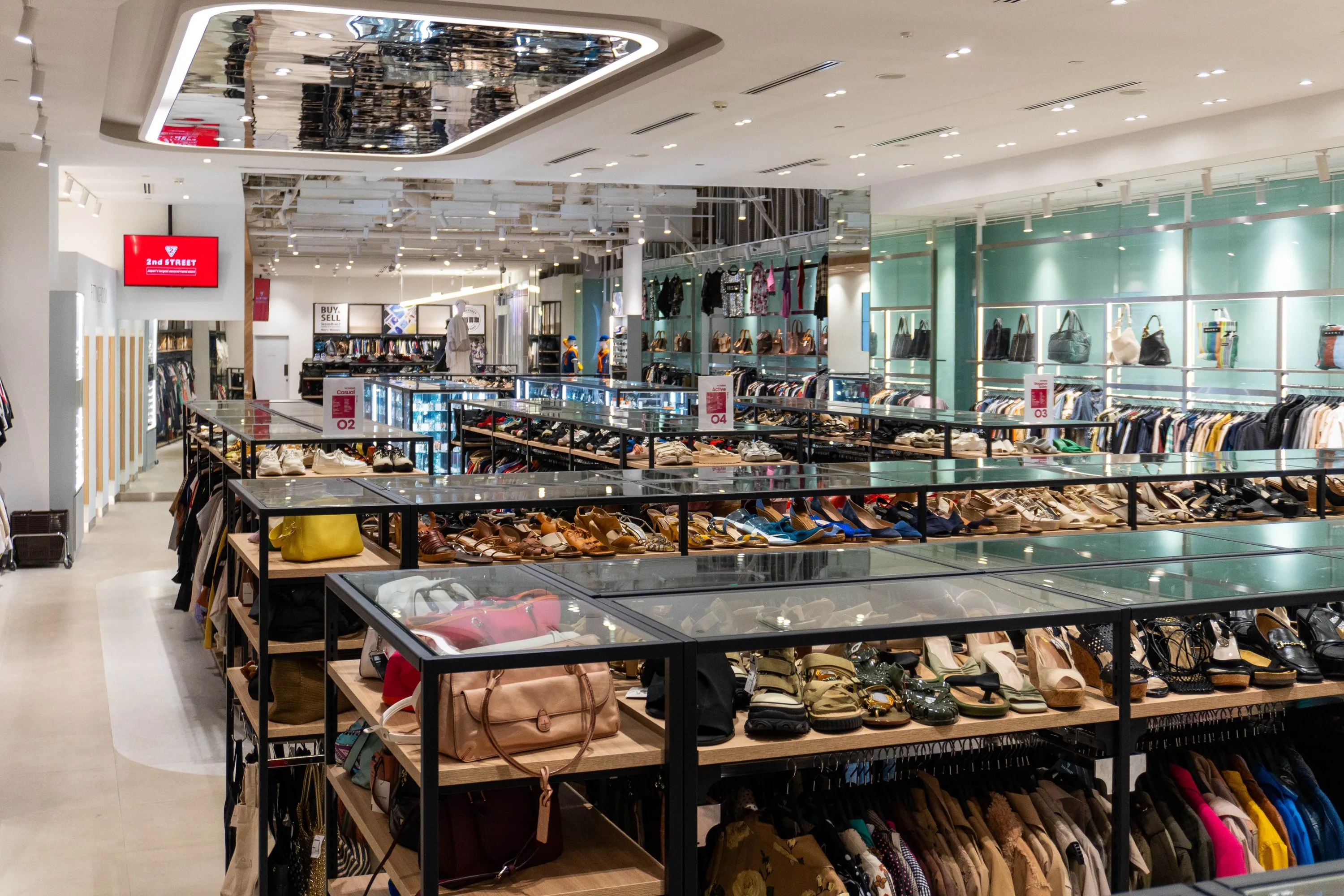 Store is in a modern mall with lifts, flat walkways, and seating.
