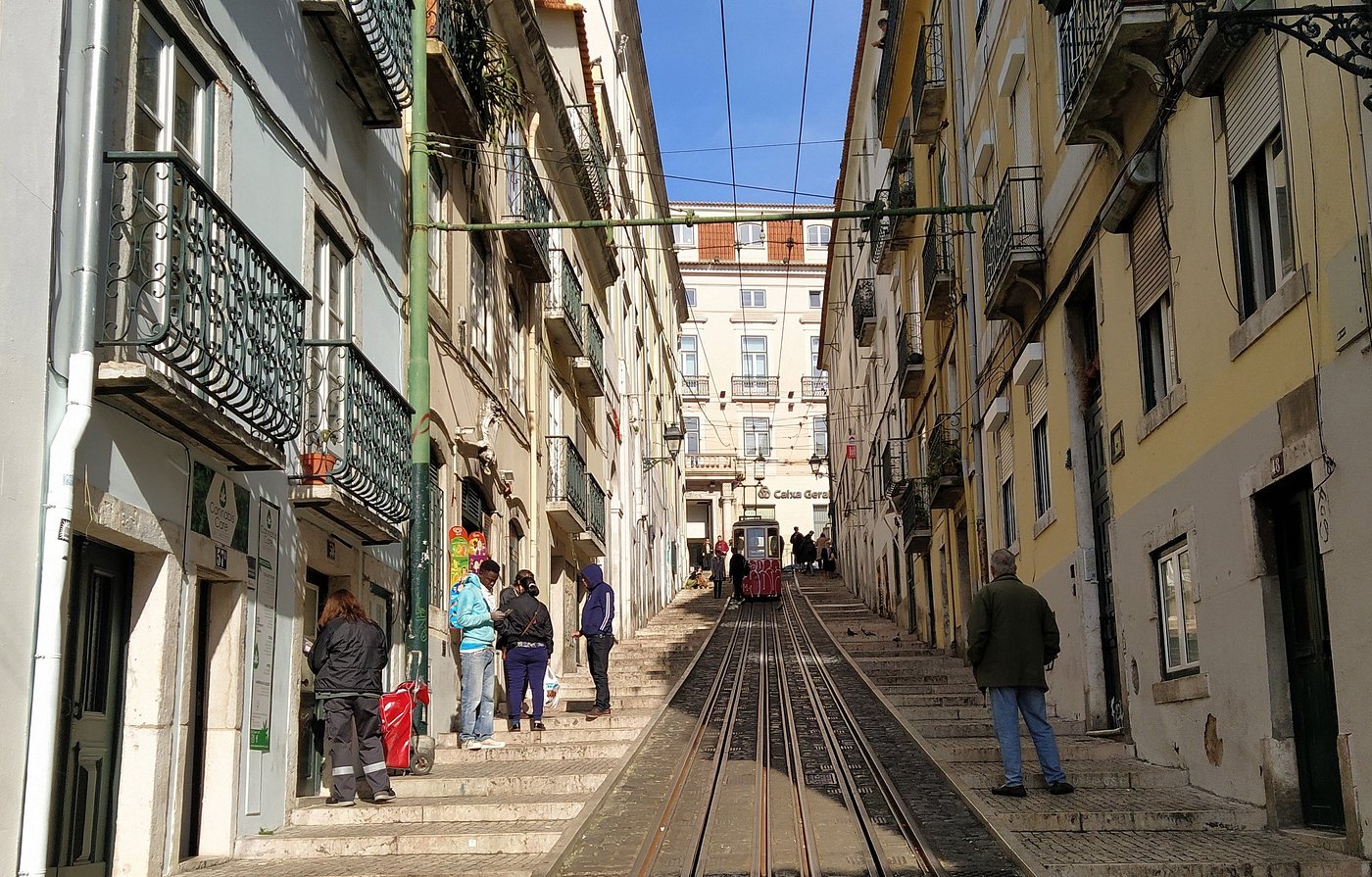 Ascend Elevador da Bica up steep Lisbon hillside