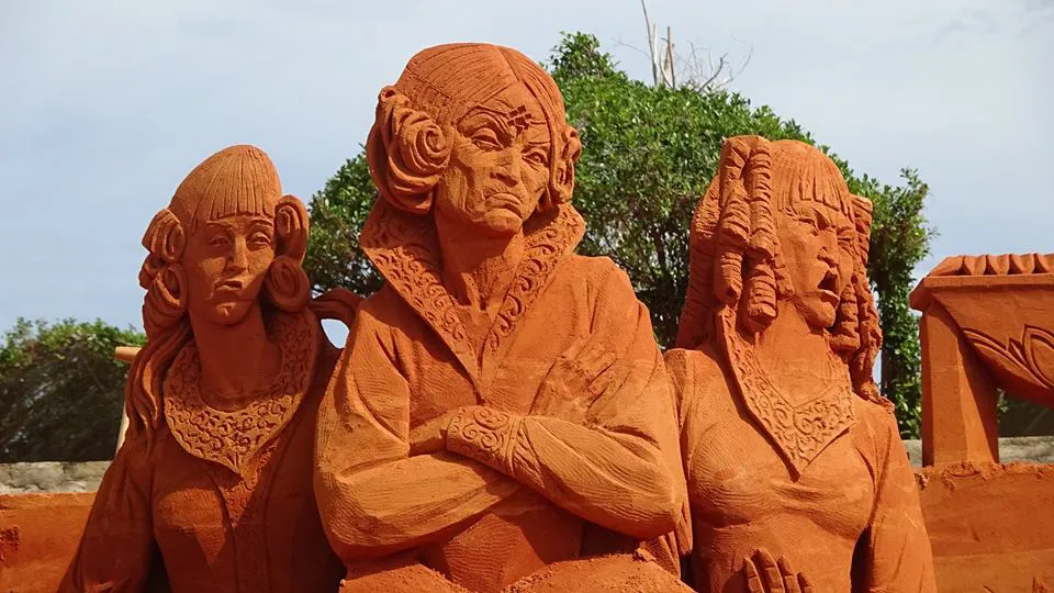 Couples enjoyed the cultural stories depicted in the sand sculptures, a shared experience.