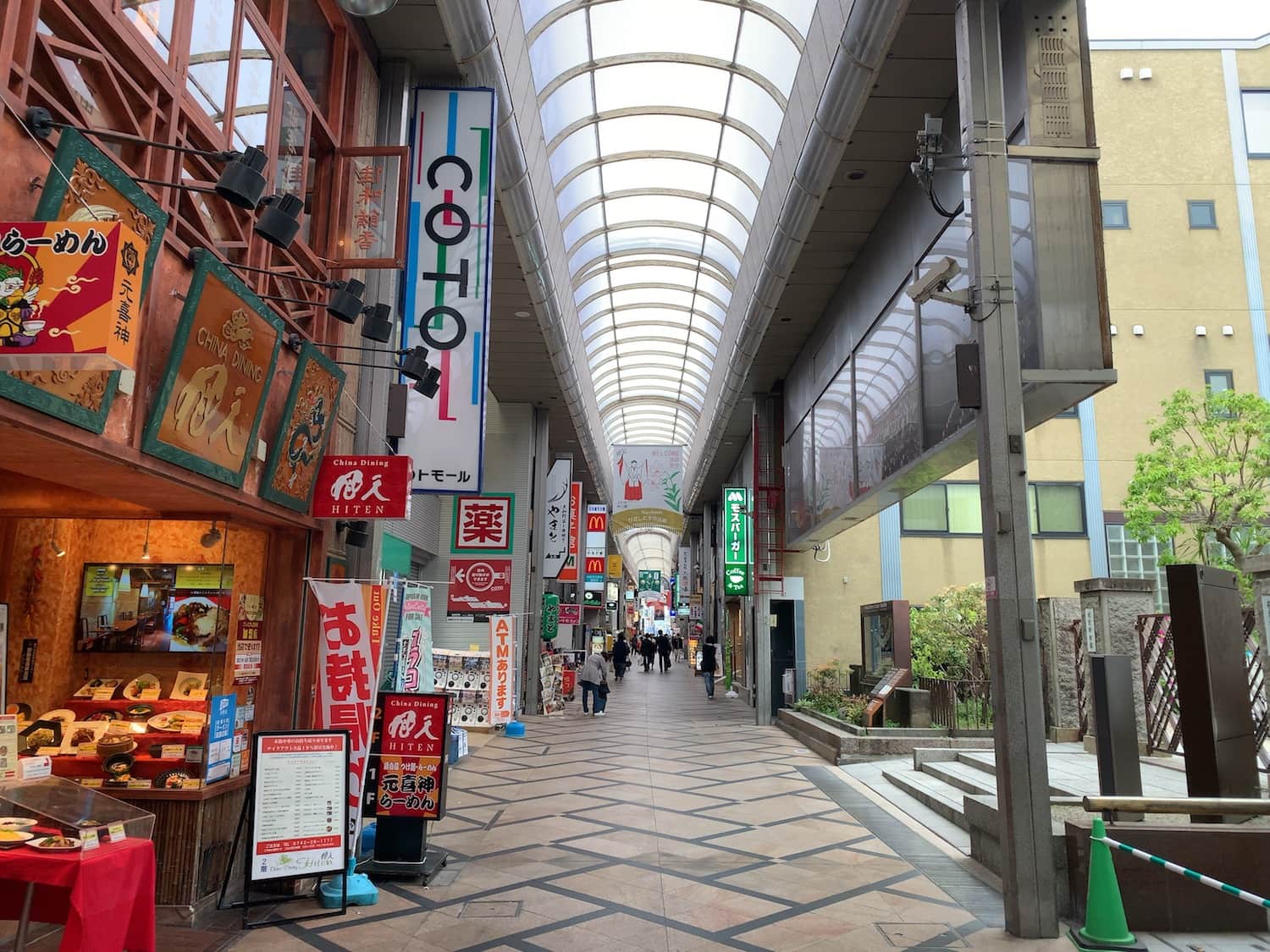 Cold winter weather with mostly dry conditions; occasional light rain. The shopping street is covered, protecting visitors from rain and wind.