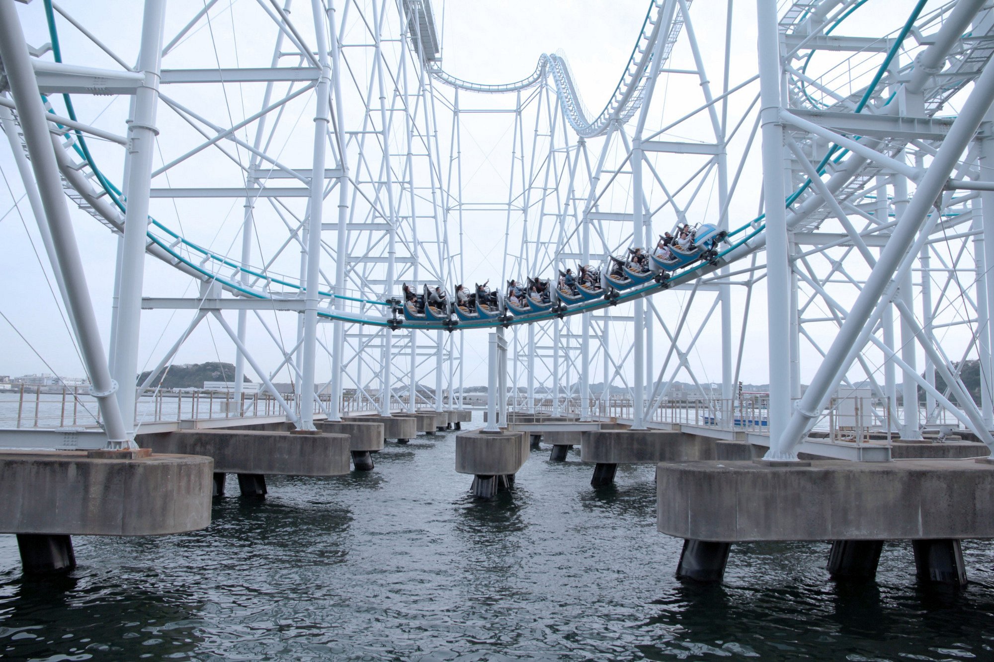 After arriving at Hakkeijima Station, visitors walk across a bridge to enter the park. The island itself is pedestrian-friendly.