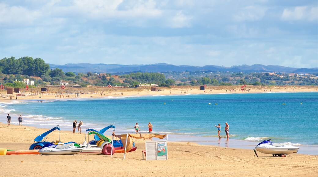 A train line runs along the coast, with a dedicated "Meia Praia" station situated towards the quieter, eastern end of the beach.