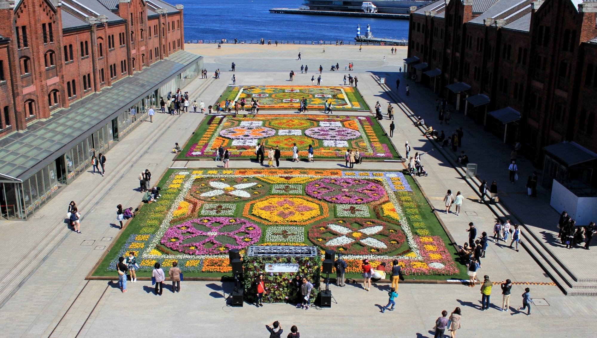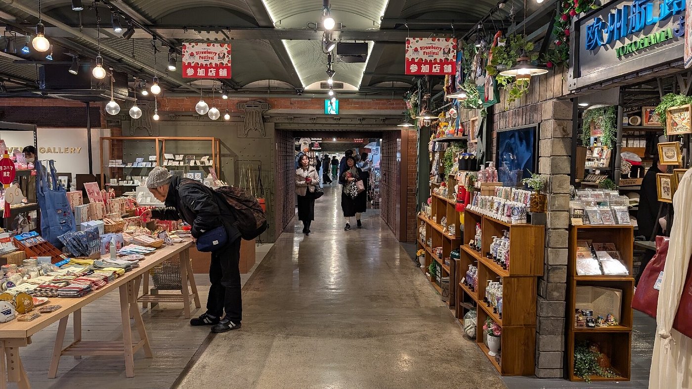 The 'Sea Bass' water bus stops directly at the pier next to the warehouses, connecting from locations such as the east exit of Yokohama Station.