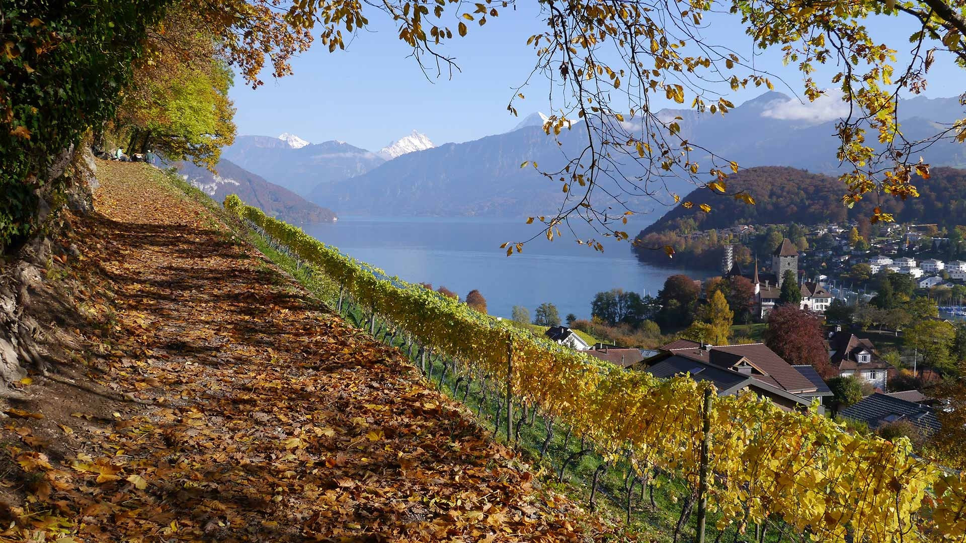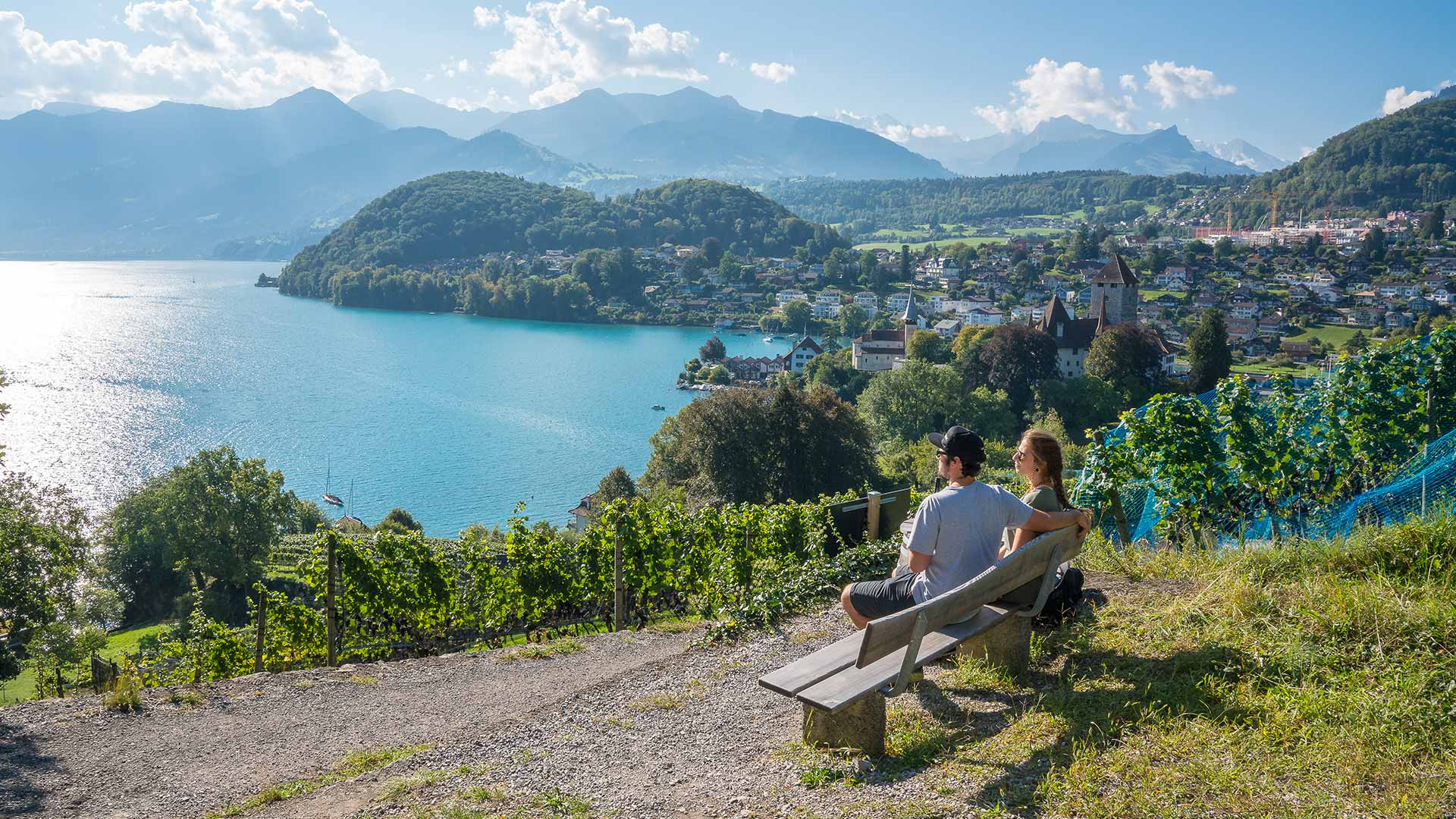 Take a boat on Lake Thun from Interlaken or Thun, disembarking at the Spiez boat landing. From the landing, walk through the town to the vineyard trail.